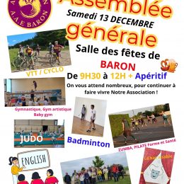 Rendez-vous le samedi 13 Decembre, (salle des fêtes de Baron) pour une matinale sous le signe de la convivialité et du partage associatif. On vous attend nombreux pour venir échanger sur le future de l’association, vos envies, vos idées. et n’oubliez pas l’apéritif offert en fin de réunion.