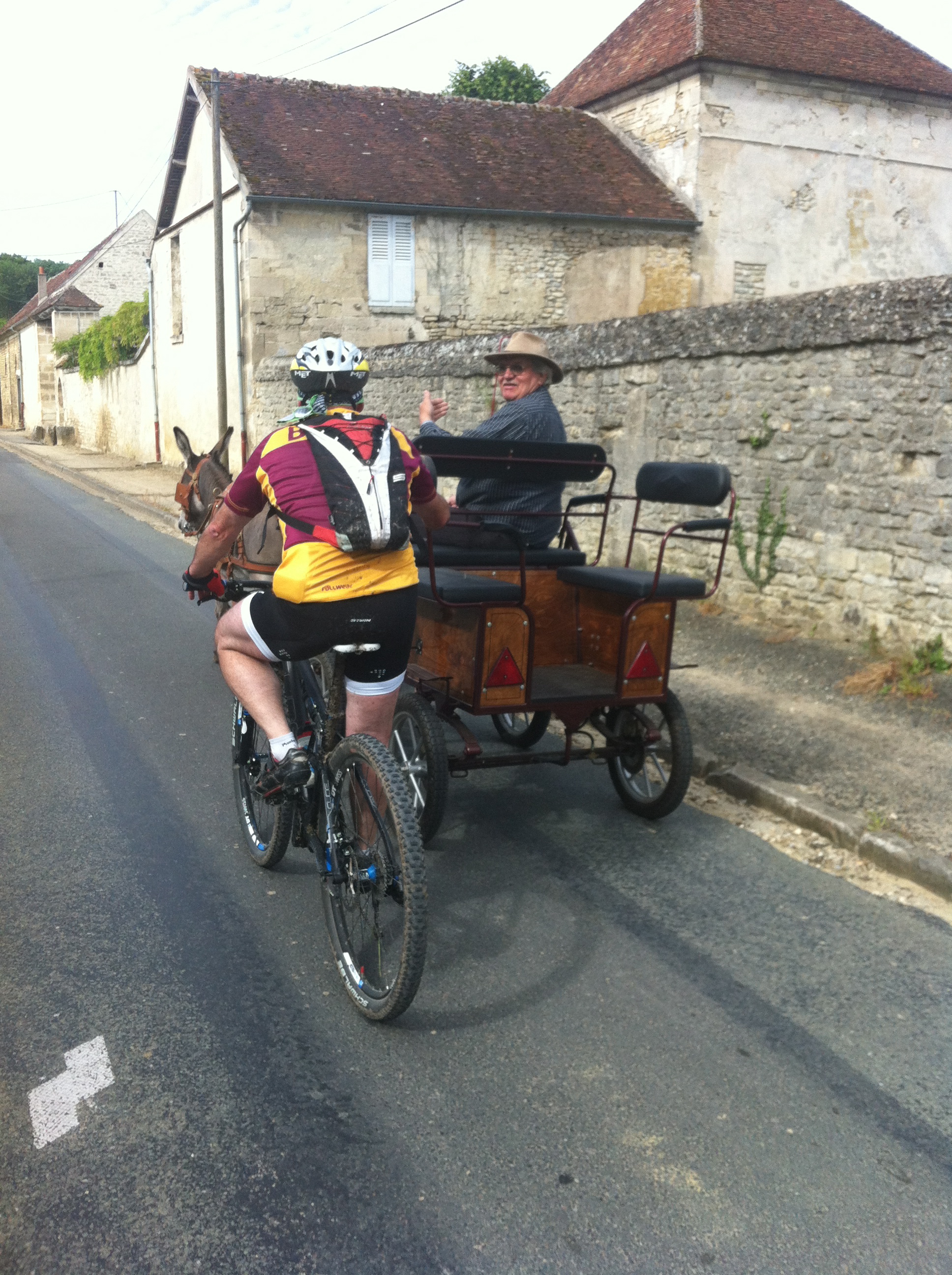 Pas mal de plaine, pas vraiment de difficultés, notre moyenne est relativement haute, jusqu’à ce que nous nous fassions ralentir par deux mules qui tirent une charette!!! Puis une biche sortant des bosquets à 5 mètres de nous! Un moment d’émotion