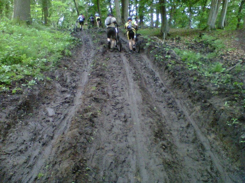 Nous démarrons avec Ritchie à 7h55 après avoir salué les vttpicards présent, les km jusqu’au 1er ravito sont un peu chargés dû évidement aux montées impossibles car trop grasse que tous font à pied, ensuite vient la bifurcation à droite le 55km et à gauche le 75 et 105km, nous restons quelques minutes a réfléchir pour savoir ce que l’on fait et finalement nous sommes venu pour le 75km donc nous partons sur le 75km, bon nombre d’inscrits sur les grands circuits bâchent à cet endroit pour finir sur le 55km, ce qui finalement en dehors du fait que le terrain c’est holliday on ice sur boue, l’on se retrouve peu nombreux, qu’il n’y a plus du tout de bouchons et que sans me déplaire nous roulons en grande partie à deux ou trois, c’est encore mieux que le dimanche matin en forêt d’Ermenonville.