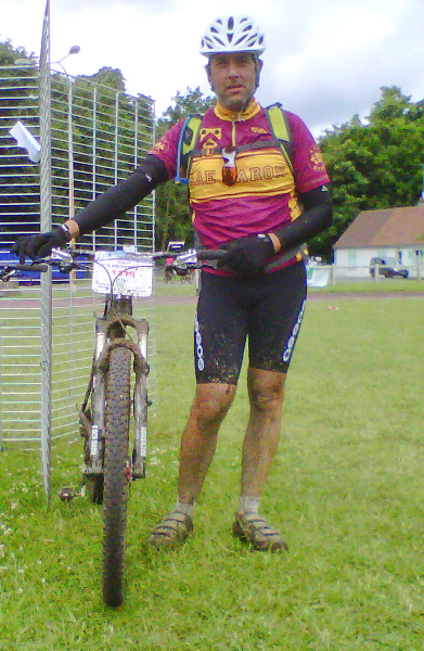 Alors concernant l’organisation, pas grand choses a redire car ravitos correctement fournis, fléchage tout a fait correct, des plaques de cadres nominatives, un tee shirt de bonne facture, des bénévoles toujours souriants, malheureusement un terrain limite praticable mais bon c’est la faute à pas de chance, un tracé super sympas c’est ce que j’ai préféré, on sent l’organisation qui a du vécu, par contre gros point négatif et ça je le regrette plus que tout, c’est qu’à l’arrivée nous n’ayons pas, vu le tarif excessif de cette manifestation, un petit sandwich et une boisson, au lieu de ça, nous aurait-on pris pour des ménagères endimanchées qui cherchent le produit qui lave plus blanc que blanc en nous offrant parmi un choix soit le produit lave vitre triple action, la lessive machin ou le liquide vaisselle dégraissant, il faut pour se restaurer encore débourser des euros pour avoir une purée et une saucisse compactées dans une barquette à frites. Sincèrement j’aurai largement préféré un petit sandwich au jambon et une canette comme il est courant de trouver sur les randos à 5€.