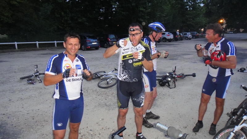 On monte la Butte aux Gens D’armes sans poser le pied a terre, et c’est presque plus facile qu’en plein jour ! Ensuite direction Senlis, ou nos amis du VCS prendrons la tète pour nous faire découvrir Senlis by night ! Quelle belle cité, avec ses ruelles pavées, si étroites, passage de petits ponts, et puis la magnifique Cathédrale Notre-Dame, avec tout son éclairage. Et puis on se dit qu’on irait bien se désaltérer à une terrasse de café pour rincer toute cette poussière. Mais il est déjà tard ; 23h30 et impossible de se faire servir en terrasse après 22h30… Du coup nos amis du VCS qui habitent dans cette belle ville, nous propose de retrouver sur une terrasse de l’un d’entre eux, et c’est Patrick qui nous invite à le suivre chez lui pour enfin pouvoir de désaltérer ! Merci a lui ainsi qu’a Richard et Sébastien qui ont fournis la 2eme, et 3eme tournée !