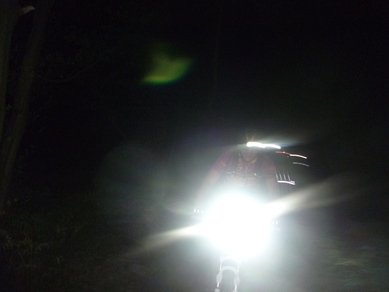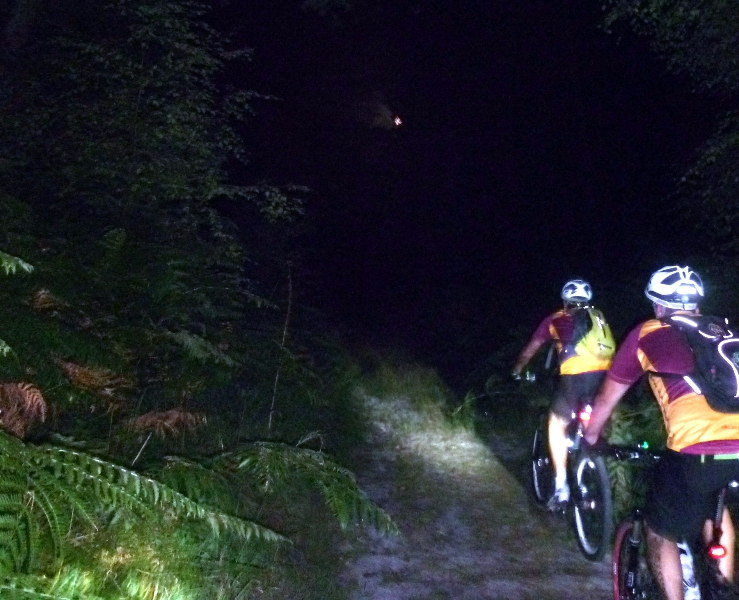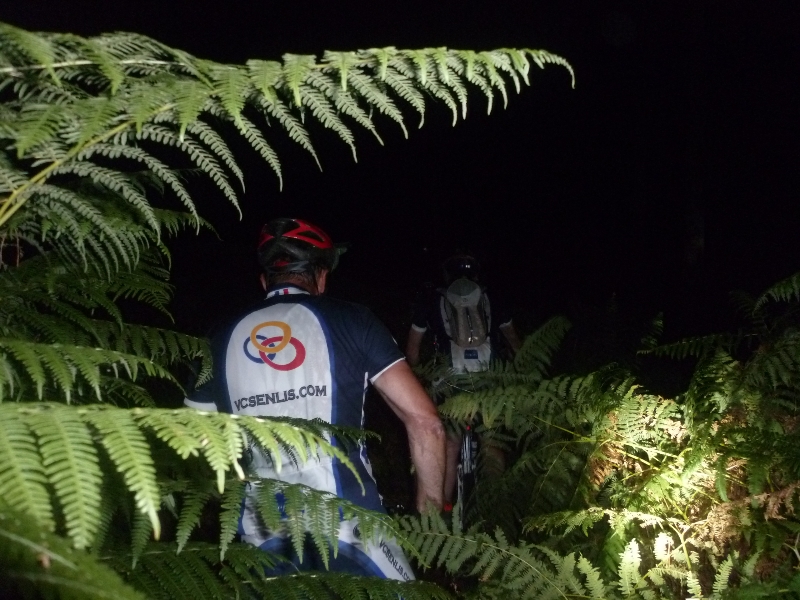 On commence par quelques chemins roulants et pas trop technique, le temps à tous le se familiariser a cette technique de pilotage bien différente de celle de jour. Tout se passe bien, et file même plutôt vite. Et puis on commence à attaquer quelques bosses, et singles-tracks, et la tous le monde se retrouve envahie de fougères, et on a du mal a trouvé la piste tellement la végétation est dense…