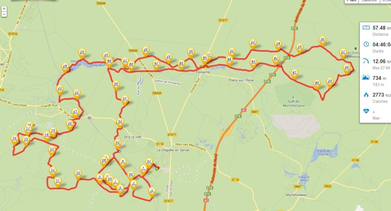 Aux inscriptions ce sera 55km pour certain ou 35 pour les autres, on rencontre des pas mal de potes du VttPicard (Charly68, puis sarcelle60) qui fera les 5 premiers km avec nous, puis il part à son rythme. Ça roule bien, assez plat, beaux paysages, puis on arrive dans la foret (la 1ere) de Coye et la fini la rigolade, on enchaine bosses sur bosses, singletracks, descentes, technique, bref que du bonheur. Apres avoir fait toutes les bosses, directions les étangs de Commelles, et son fameux (et interminable) single. Quel single magnifique, plein de relance, dévers, zigzag entre les arbres sur cette monotrace étroite. Retour vers Pontarmé, pour le 2eme ravito face au château, avec le soleil en prime. On rencontre 2 potes ‘encore …) du forum vttpicard, Ludosilver et King Julian. On reprend eu peu de force et on repart tous ensemble cette fois ci en direction le la foret d’Ermenonville. Chouette c’est chez nous ! une liaison tip top en foret, sympa (ils ont en effet bien fait de modifier par rapport aux années précédentes). Puis on re commence à monter en attaquant la buttes aux gens d’armes par son fameux single très technique, puis la descente de l’autre coté tout aussi technique. On virevolte par ci par la, puis on arrive on single qui nous emmène aux 2 bosses du golf de Mortefontaine. Donc 2 montées et …. 2 descentes dignes d’une session d’enduro. Puis on file de nouveau rejoindre pontarmé pour un 3eme ravito. Direction Coye la foret pour le final, et une suite de singletracks incroyable nous emmènera jusqu’à l’arrivée.