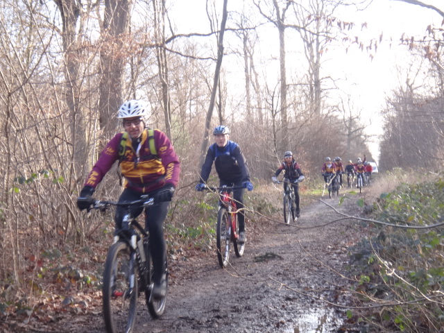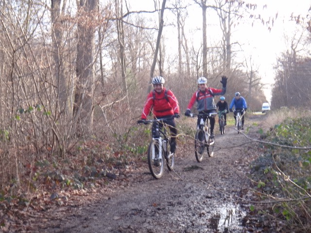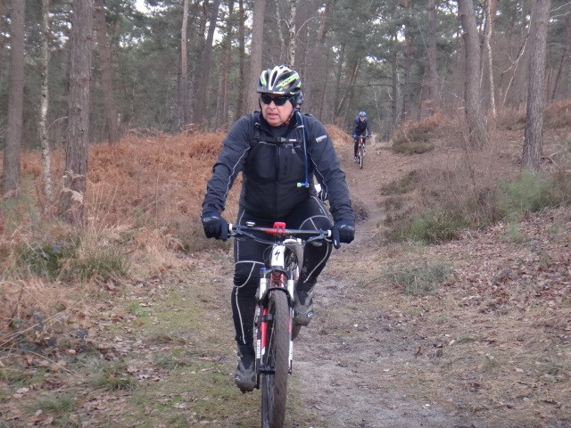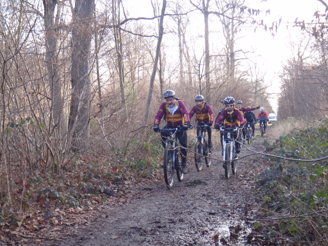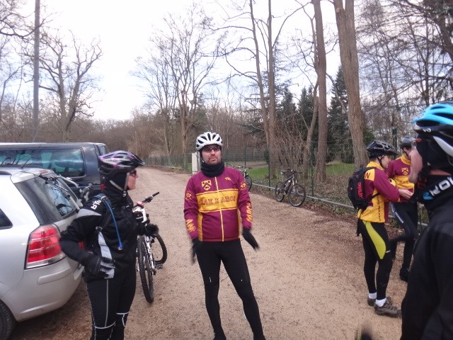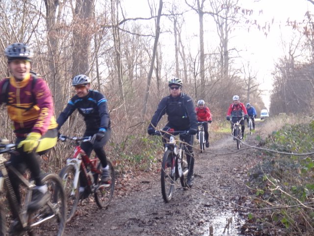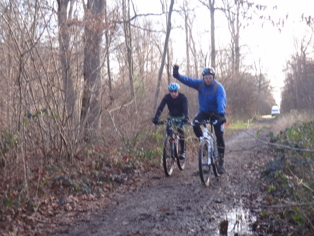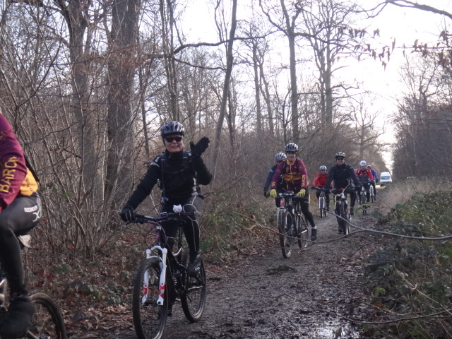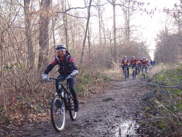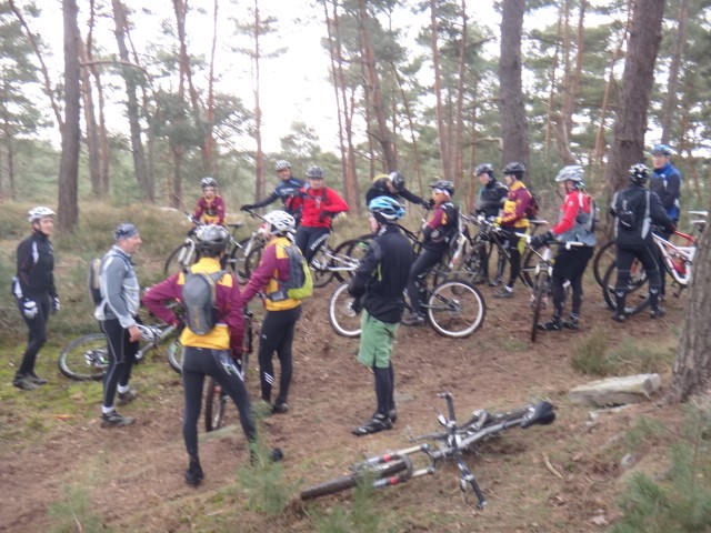 Nous voila parti, pour une bonne balade en forêt, sable super, soleil présent a certain moment, même éblouissant, Didier nous ouvre les chemins sa roule bien en fil indienne et on n’est pas mal quand même. Passage par la Baraque Chaalis et la on retrouve Zorg avec un poto a lui, sa discute et on repart tous ensemble direction la butte aux gendarmes, nous croisons François et un poto, qui rejoint notre groupe et sur le chemin Philipe nous quitte pour un rendez-vous avec madame, (bien mangé Philippe). François perd un bout de pédale, mais sa roule. Nous montons la butte, et une fois en haut, Didier nous dit on la monte deux fois, tous le monde suit donc c’est parti, deuxième arrivée en haut , il nous manque Patrick et Mumu. A les voila!! Patrick a fait un passage par l’avant, la souche était trop forte. On remarque qu’il a perdu son compteur, on file vite fait le récupérer et nous voila tous réuni pour repartir sur le retour.