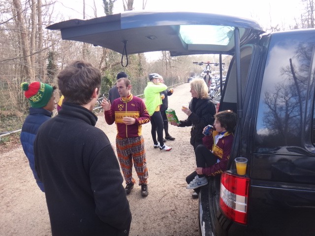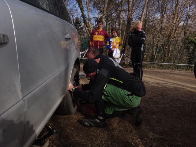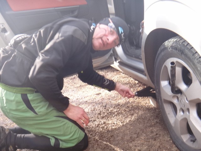 Fred qui n’a pas des semaines chargées, se met tout de suite au boulot pour changer la roue, Ahhh du boulot!!!, il est super heureux. Au loin voila les routes, mince Karl a du se faire peur, il est tout blanc, a non c’est notre Président, par contre plus de Karl. Didier nous sort du multi vitaminés, un peu de bière et des chips, sa papotes et chacun repart de son coté. Pour ma par une bonne matinée, et je pense que l’effet Mumu était présent, car sa faisait longtemps que nous n’étions pas sortie avec autant de personne en une sortie.