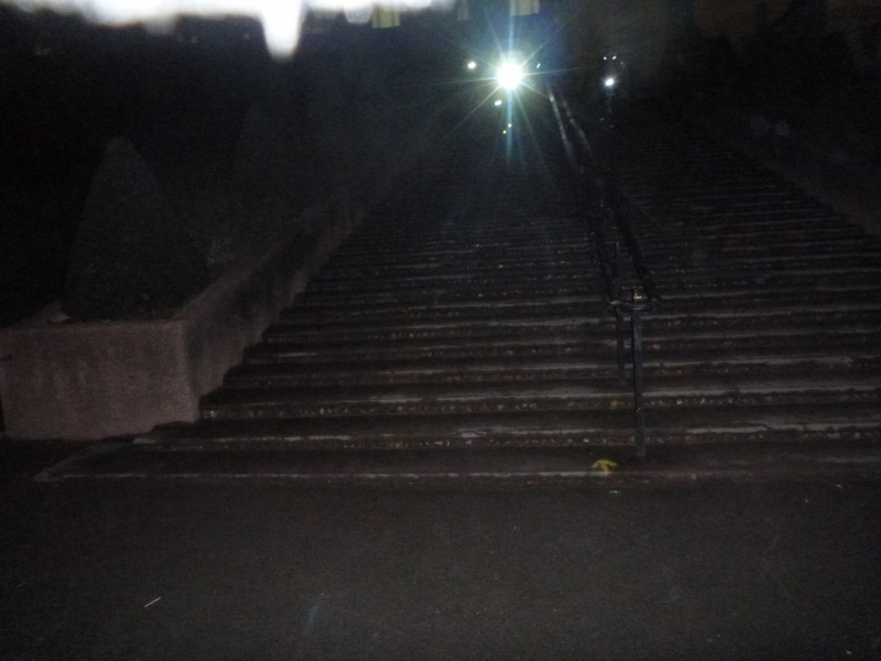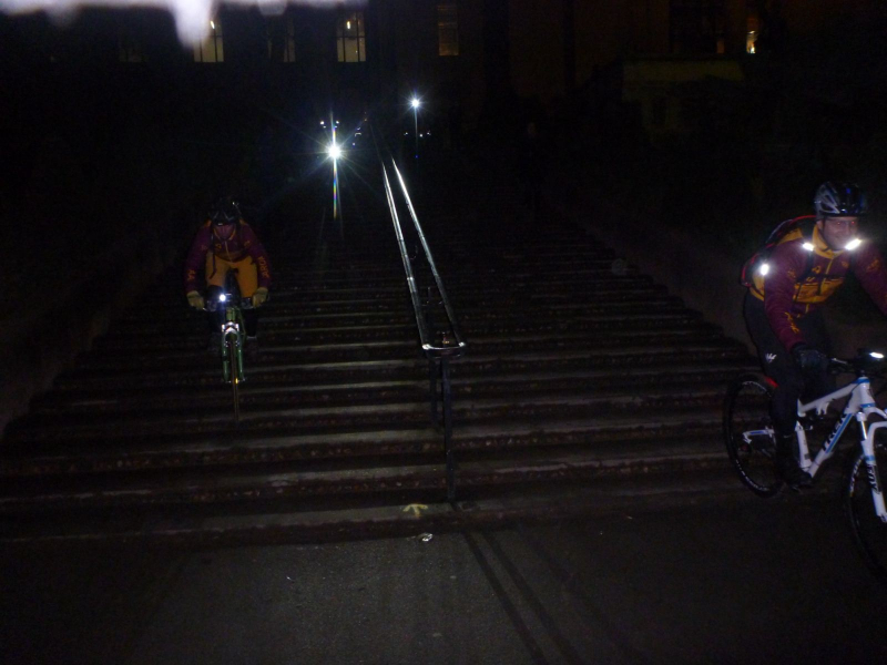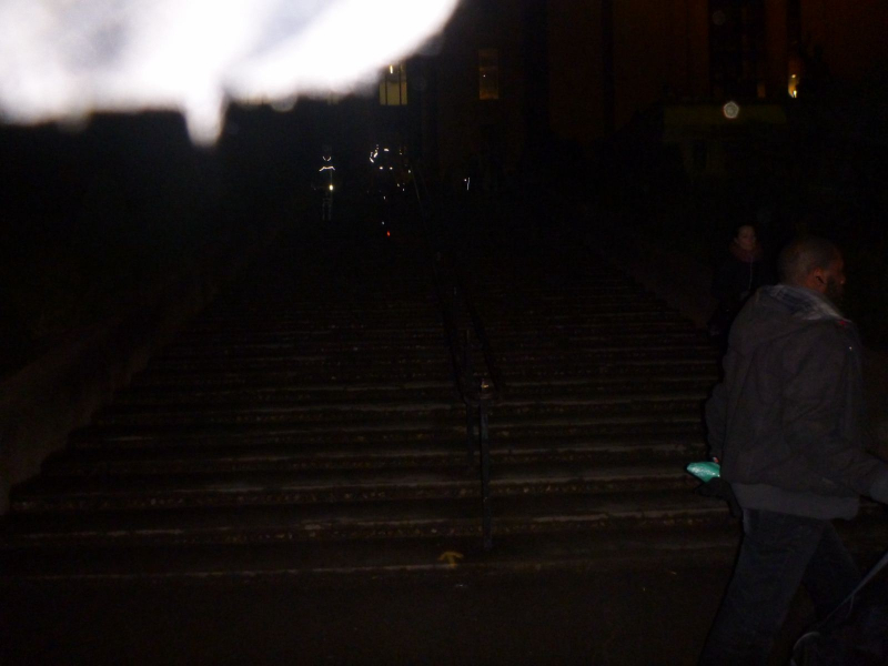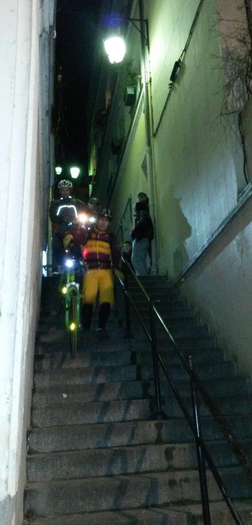 Arrivé en haut, on roule encore un peu tranquillement dans la foule et la a gauche nous dit l’ami Luis et la saut sur les freins car une toute petite descente en 100% escalier (au bas mot je dirais une bonne 100ène de marches)