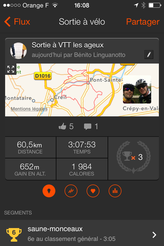 Là, on se demande ce que l’on fait demi tour ou on prend la carte à l’ancienne. Bon aller, un coup de course d’orientation sur la carte et en route avec le boulet binome du jour qui ouvre en mode VDM. On lâche les watts avec un vent de face. Nous décidons donc de rejoindre par la route l’autre coté de la berge. Apres une bonne bourre façon contre la montre sur route en VTT, nous revoici sur le droit chemin à Verneuil-En-Halatte. Un petit coucou aux autres organisateurs du Trail, on échangera quelques relais évidement et on retrouvera la trace avec une prime de 5 bornes le tout dans le vent et les genoux bien chaud pour nous.